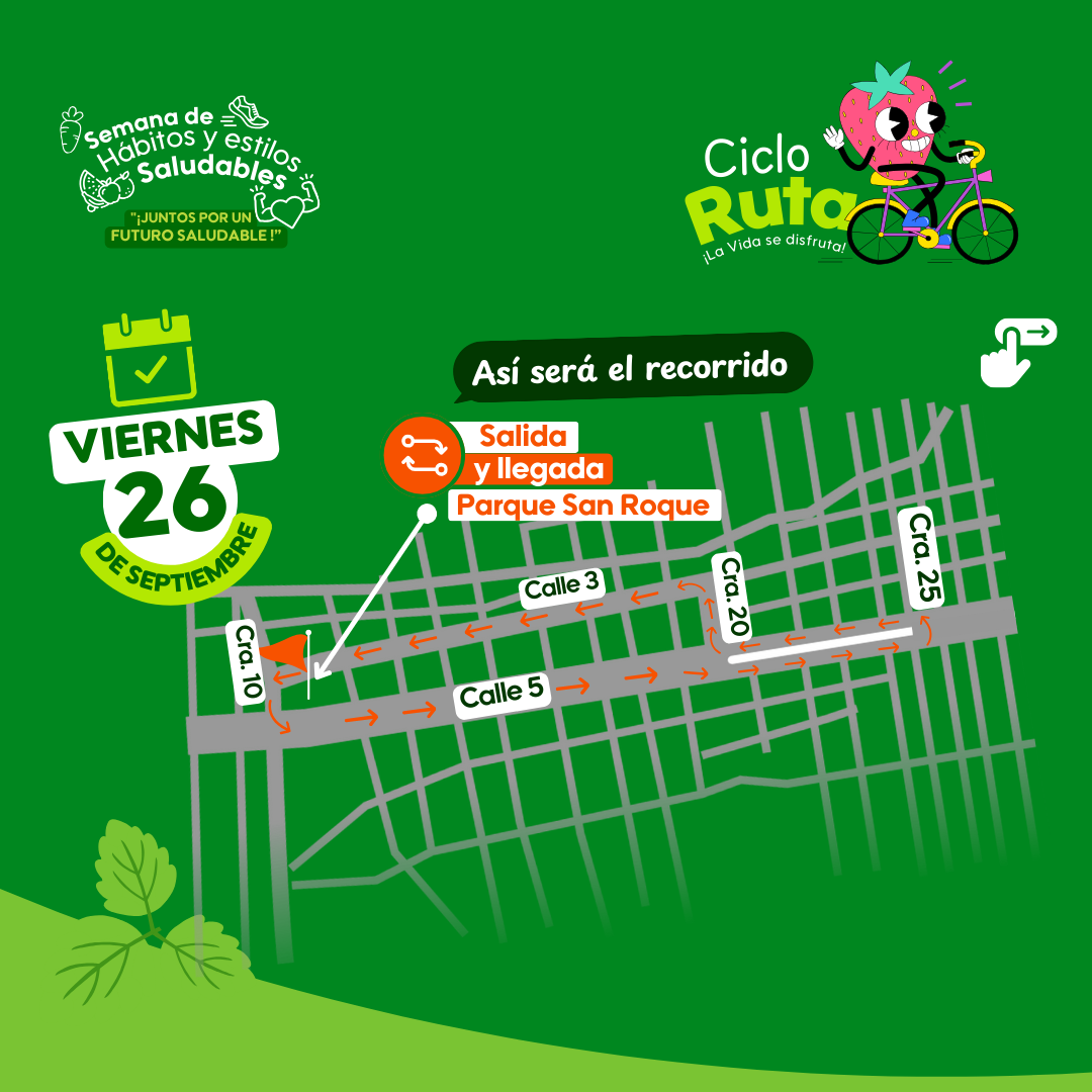¡La vida se disfruta pedaleando en comunidad! Este viernes 26 de septiembre a las 5:00 de la tarde te esperamos en la CicloRuta de la Semana de Hábitos y Estilos Saludables.